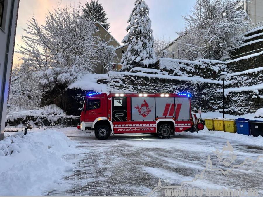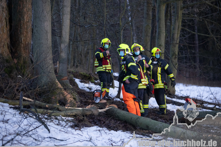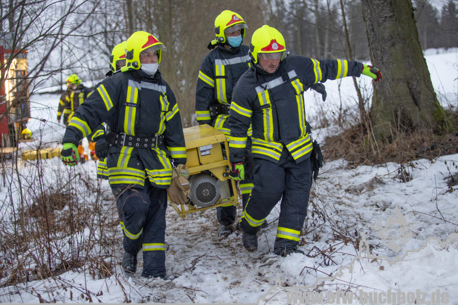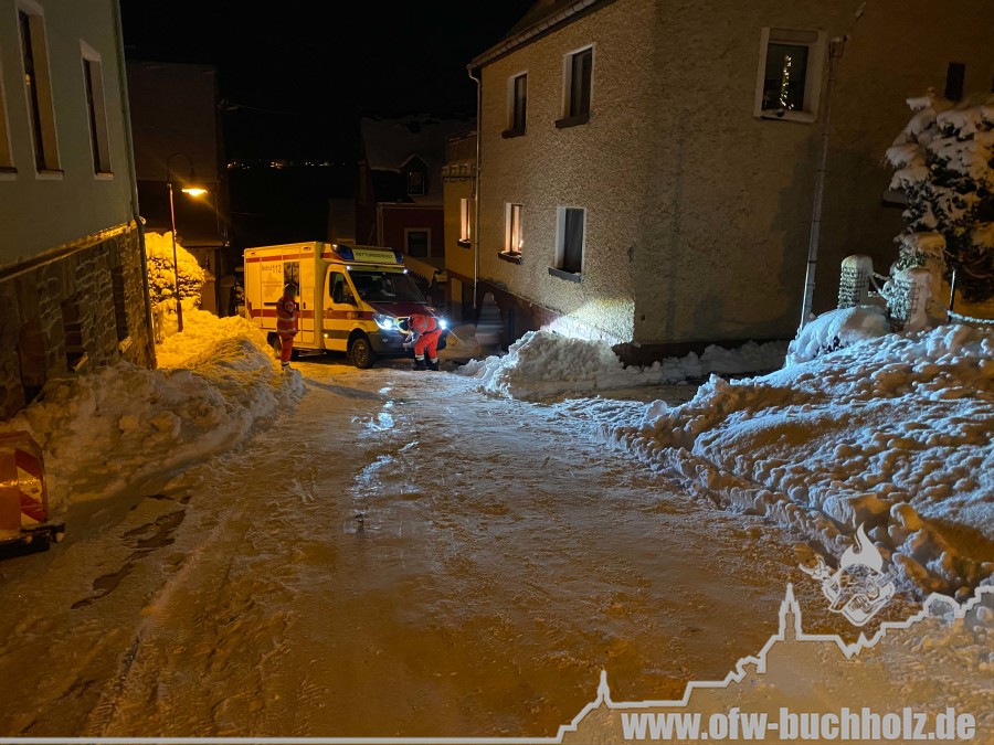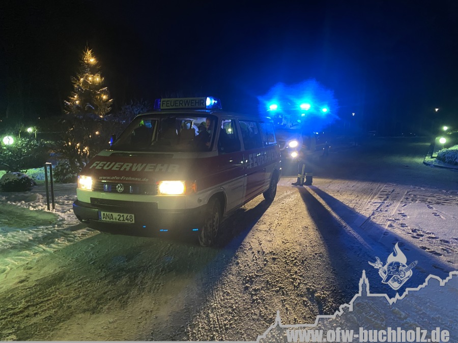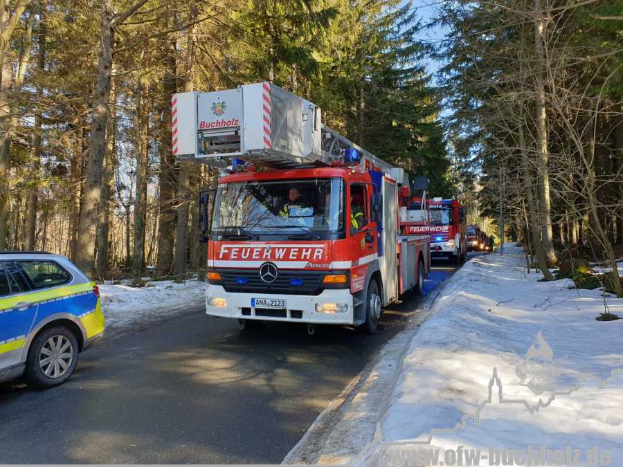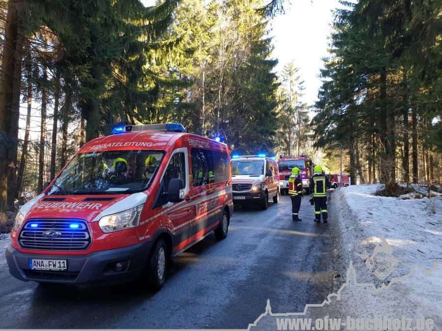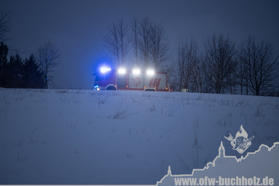 Zusammen mit der Feuerwehr Frohnau wurden wir zur technischen Hilfeleistung alarmiert. Ein Waldarbeiter wurde bei Fällarbeiten von einem Baum getroffen und teilweise begraben. Schon während der Anfahrt gestaltete es sich schwierig, den Einsatzort ausfindig zu machen. Der Einsatzleitwagen übernahm von Beginn an die Kommunikation zur Leitstelle, um den Unfallort ausfindig machen zu können. Das Hilfeleistungslöschfahrzeug suchte den Unfallort vom Markus-Röhling-Stollen aus. Der Einsatzleitwagen erreichte zusammen mit dem Einsatzleiter die Gaststätte „Bergschmiede“ und suchte in Fahrtrichtung HLF ebenfalls die Einsatzstelle. Nach mehreren Ortungsmöglichkeiten des Anrufers und unserer Fahrzeuge konnte die Leitstelle uns navigieren. Dabei sei gesagt, dass bei solch Einsätzen die moderne Technik uns immer mehr unterstützt. Der Angriffstrupp der Drehleiter begab sich auf den Weg zum Verletzten. Dieser musste alle konditionellen Fähigkeiten einsetzen, denn es galt meterhohe Schneewehen zu durchqueren. Dies galt ebenfalls für den Rettungsdienst und den Notarzt. Der Einsatzleitwagen teilte in der Zwischenzeit den Anfahrtsweg zur Einsatzstelle den restlichen Einsatzkräften mit. Das Löschfahrzeug aus Buchholz und das HLF konnten über einen anderen Zufahrtsweg die Einsatzstelle erreichen. Bis zum Eintreffen des Rettungsdienstes wurde der Patient von unseren Kameraden erstversorgt. Für das Eintreffen eines Rettungshubschraubers wurde ein Landeplatz ausgeleuchtet. Weitere Einsatzkräfte aus Frohnau brachten weitere Gerätschaften vom Rettungswagen zur Einsatzstelle. Hierfür braucht es schnelle Ideen, so wurde zügig ein Schneemobil zur Verfügung gestellt, der das Arbeiten deutlich erleichterte. Der Patient wurde in ein Krankenhaus geflogen. Für die Kameraden begannen die Nachbereitungsarbeiten – völlig durchnässt und ausgepowert.