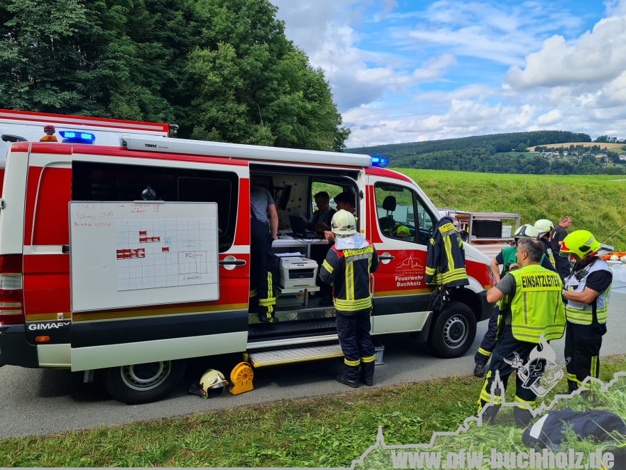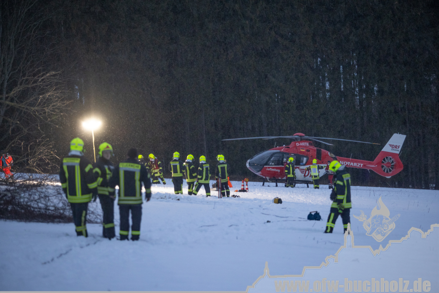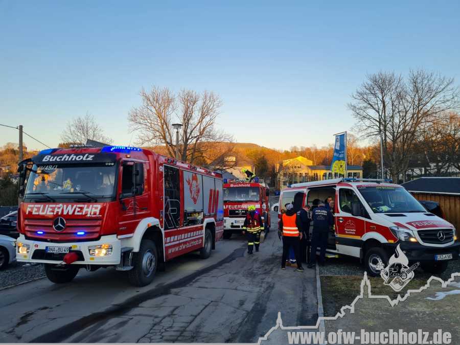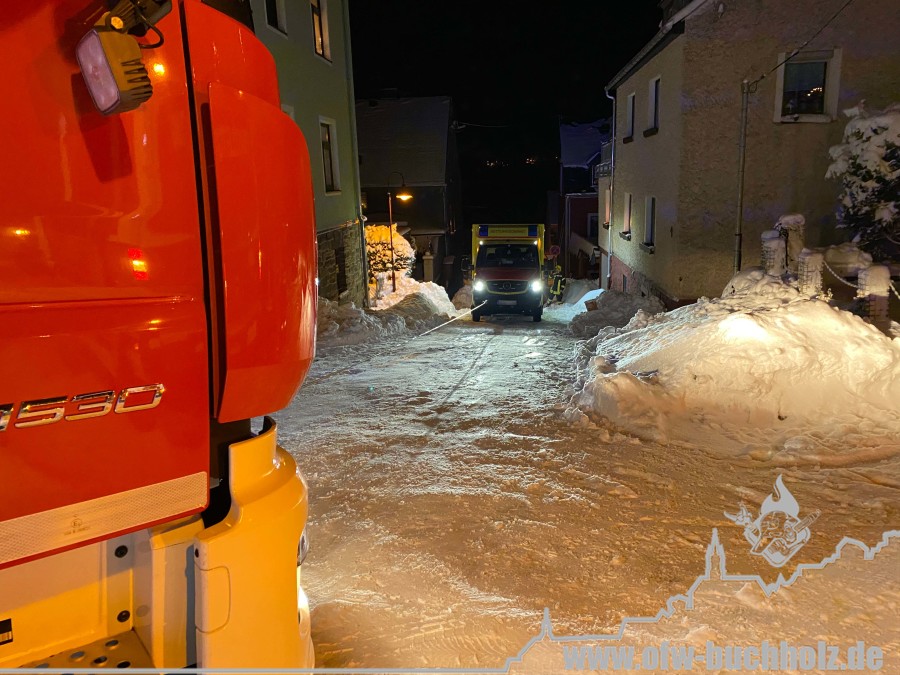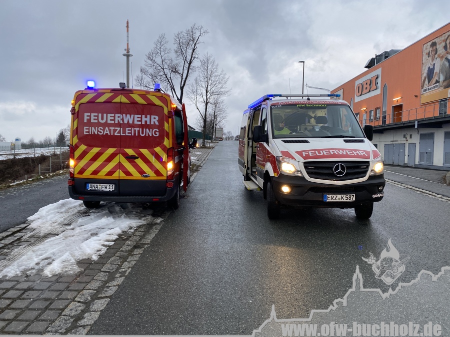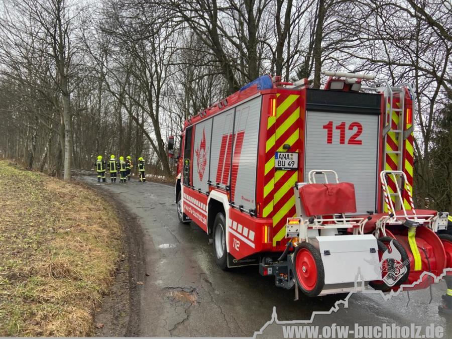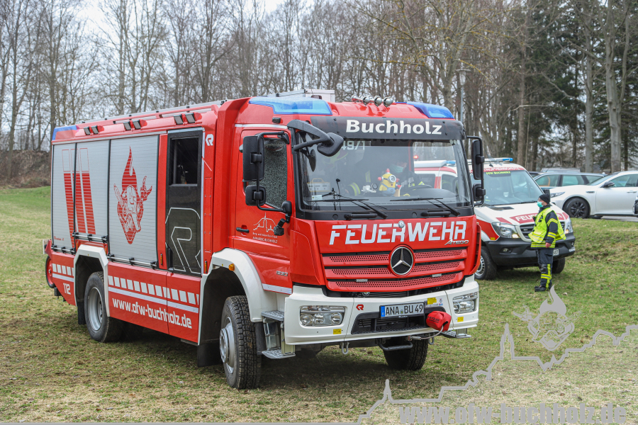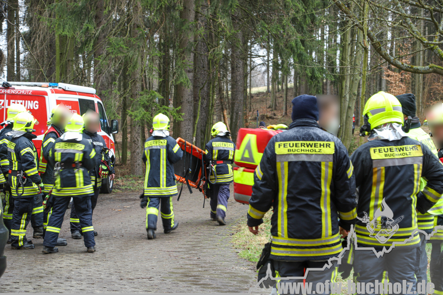 Zusammen mit der Feuerwehr Frohnau wurden wir zur technischen Hilfeleistung alarmiert. Ein Waldarbeiter wurde bei Fällarbeiten von einem Baum getroffen und teilweise begraben. Schon während der Anfahrt gestaltete es sich schwierig, den Einsatzort ausfindig zu machen. Der Einsatzleitwagen übernahm von Beginn an die Kommunikation zur Leitstelle, um den Unfallort ausfindig machen zu können. Das Hilfeleistungslöschfahrzeug suchte den Unfallort vom Markus-Röhling-Stollen aus. Der Einsatzleitwagen erreichte zusammen mit dem Einsatzleiter die Gaststätte „Bergschmiede“ und suchte in Fahrtrichtung HLF ebenfalls die Einsatzstelle. Nach mehreren Ortungsmöglichkeiten des Anrufers und unserer Fahrzeuge konnte die Leitstelle uns navigieren. Dabei sei gesagt, dass bei solch Einsätzen die moderne Technik uns immer mehr unterstützt. Der Angriffstrupp der Drehleiter begab sich auf den Weg zum Verletzten. Dieser musste alle konditionellen Fähigkeiten einsetzen, denn es galt meterhohe Schneewehen zu durchqueren. Dies galt ebenfalls für den Rettungsdienst und den Notarzt. Der Einsatzleitwagen teilte in der Zwischenzeit den Anfahrtsweg zur Einsatzstelle den restlichen Einsatzkräften mit. Das Löschfahrzeug aus Buchholz und das HLF konnten über einen anderen Zufahrtsweg die Einsatzstelle erreichen. Bis zum Eintreffen des Rettungsdienstes wurde der Patient von unseren Kameraden erstversorgt. Für das Eintreffen eines Rettungshubschraubers wurde ein Landeplatz ausgeleuchtet. Weitere Einsatzkräfte aus Frohnau brachten weitere Gerätschaften vom Rettungswagen zur Einsatzstelle. Hierfür braucht es schnelle Ideen, so wurde zügig ein Schneemobil zur Verfügung gestellt, der das Arbeiten deutlich erleichterte. Der Patient wurde in ein Krankenhaus geflogen. Für die Kameraden begannen die Nachbereitungsarbeiten – völlig durchnässt und ausgepowert.